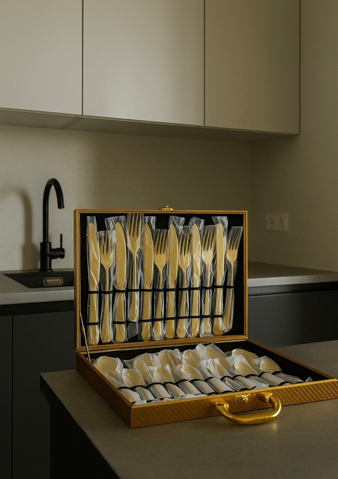 Įrankiai iš metalo, aukso spalvos. Dėžė medinė, aukso spalvos. Įrankiai, kokybiški. Įrankius galima plauti indaplovėje.